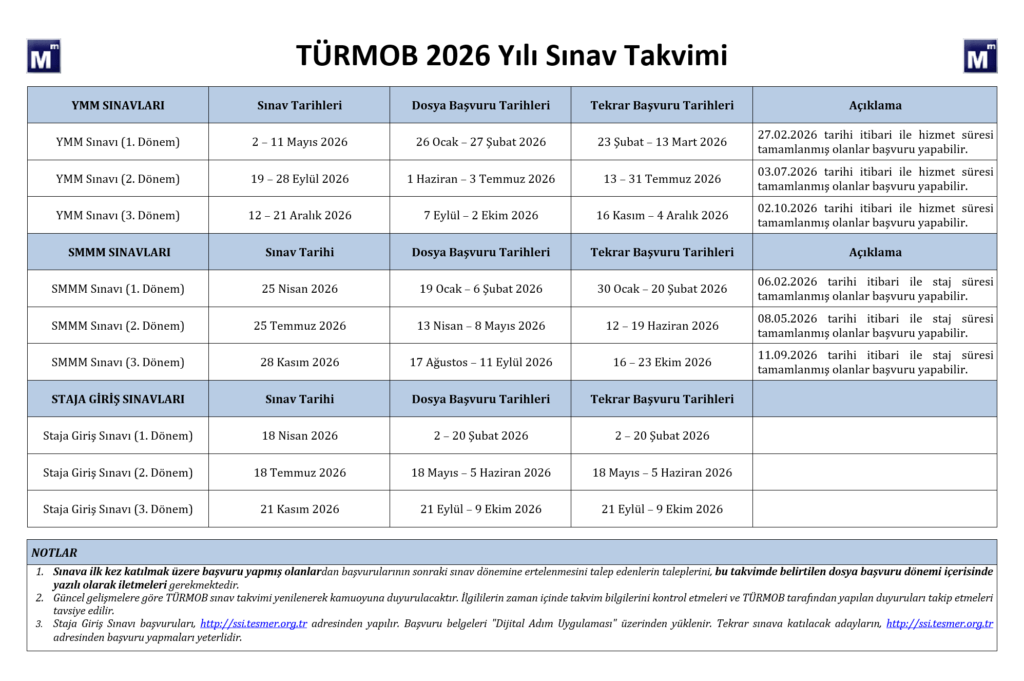 TÜRMOB 2026 Yılı Sınav Takvimi Bilgilendirme Önemli Sınav Takvimi ve Bedeller 14 Ocak 202615 Ocak 2026 TÜRMOB TESMER10703 TÜRMOB 2026 Yılı Sınav Takvimi 2026 Yılı Sınav ve Eğitim Ücretleri
